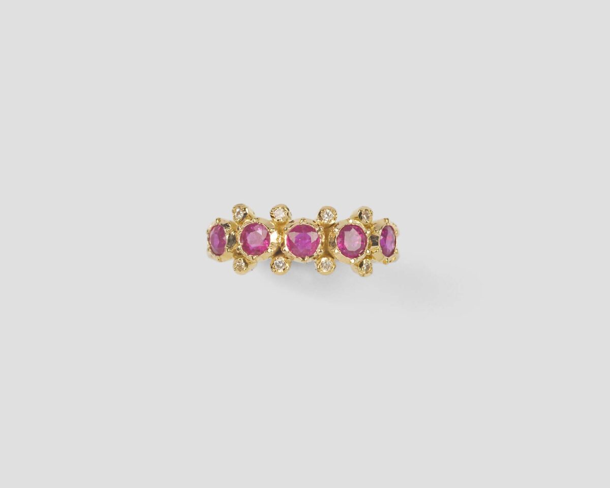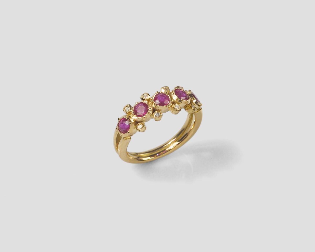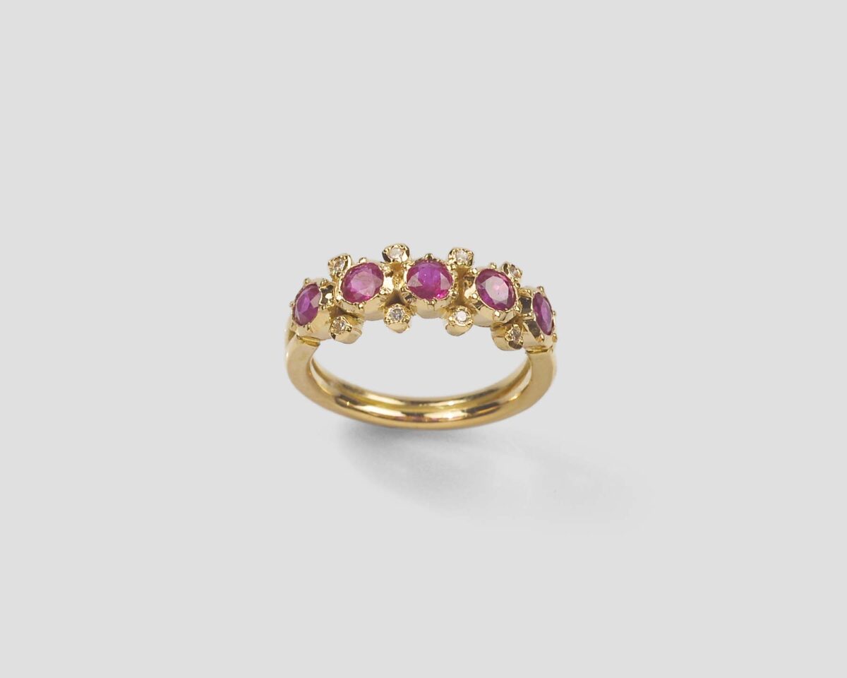 Anel em ouro amarelo com 5 rubis redondos e diamantes, com cravação antiga.