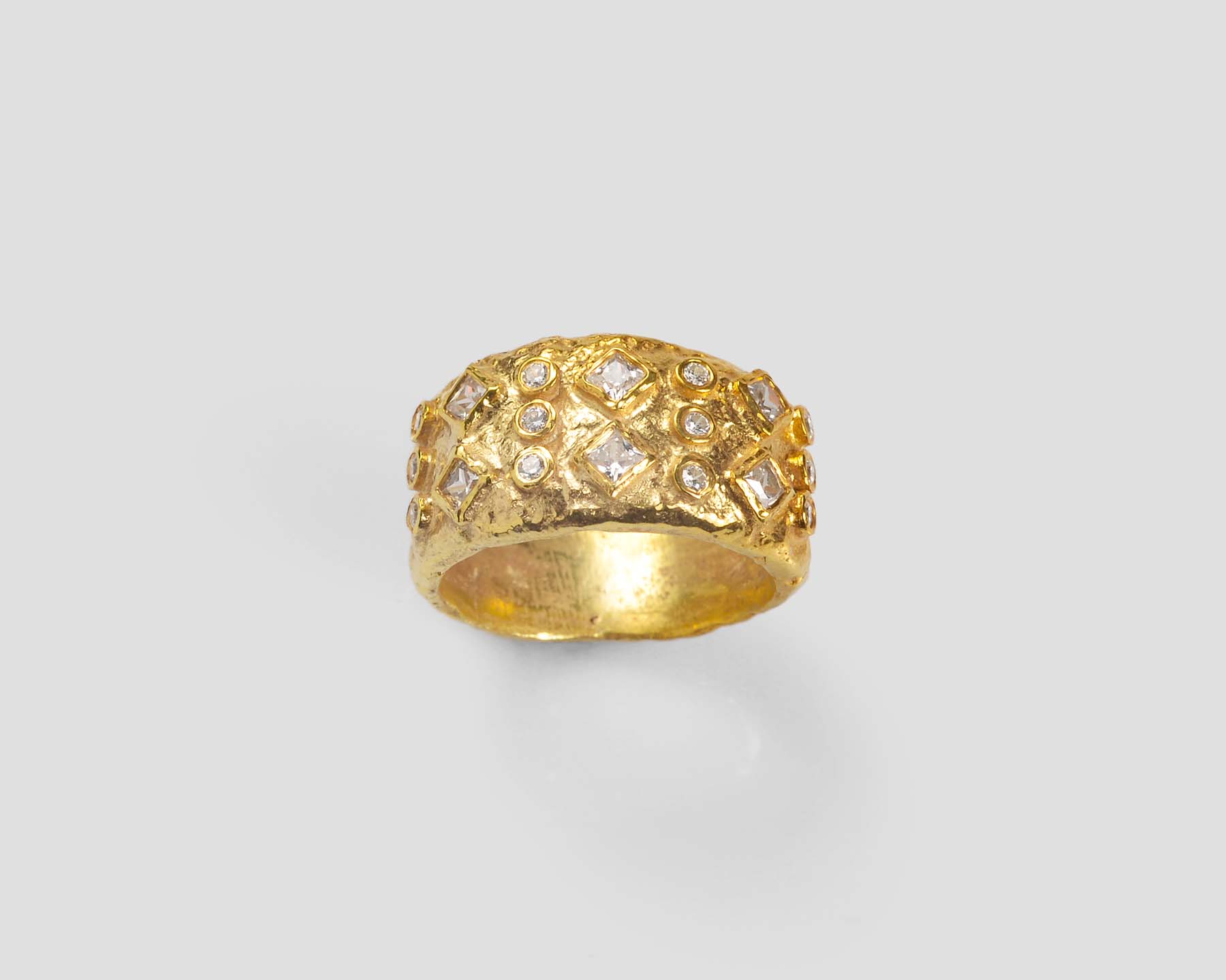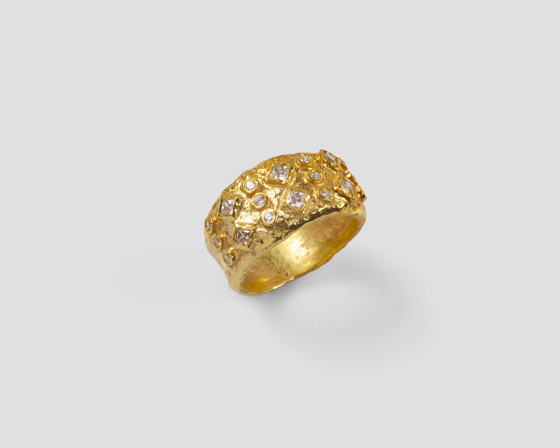 Anel em ouro amarelo martelado com diamantes, em corte brilhante. Com 12 diamantes redondos e 6 diamantes quadrados.