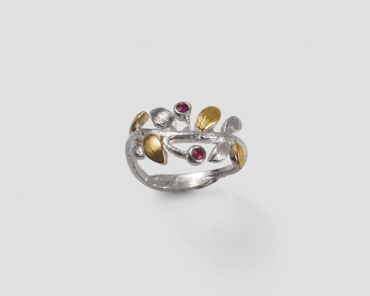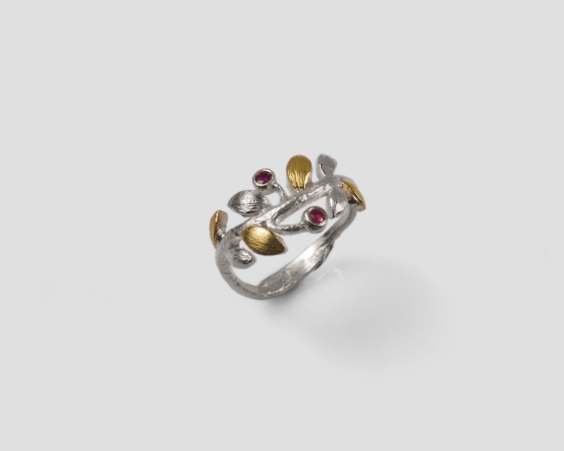 Anel em ramos com folhas riscadas com dois rubis redondas, em prata e ouro.