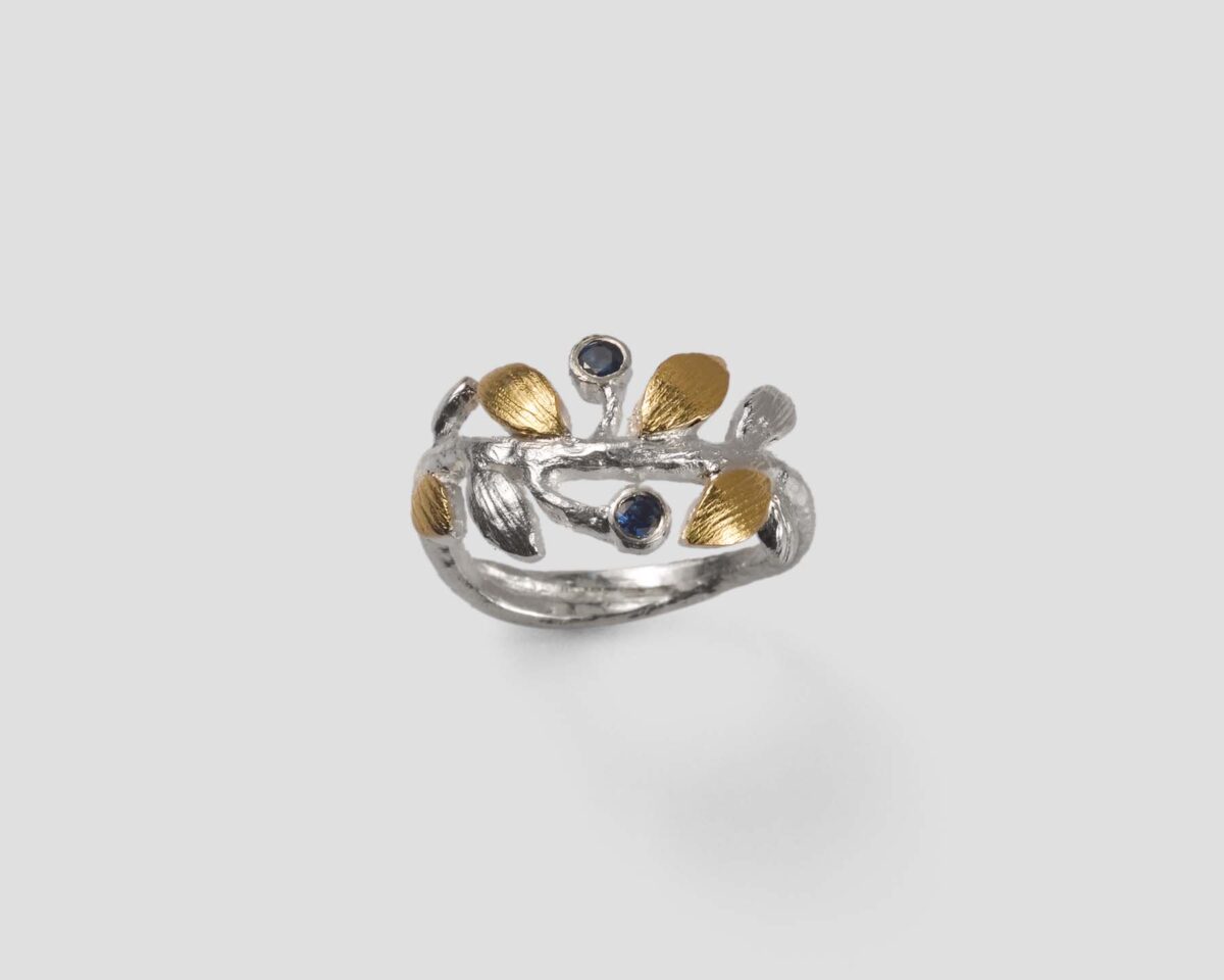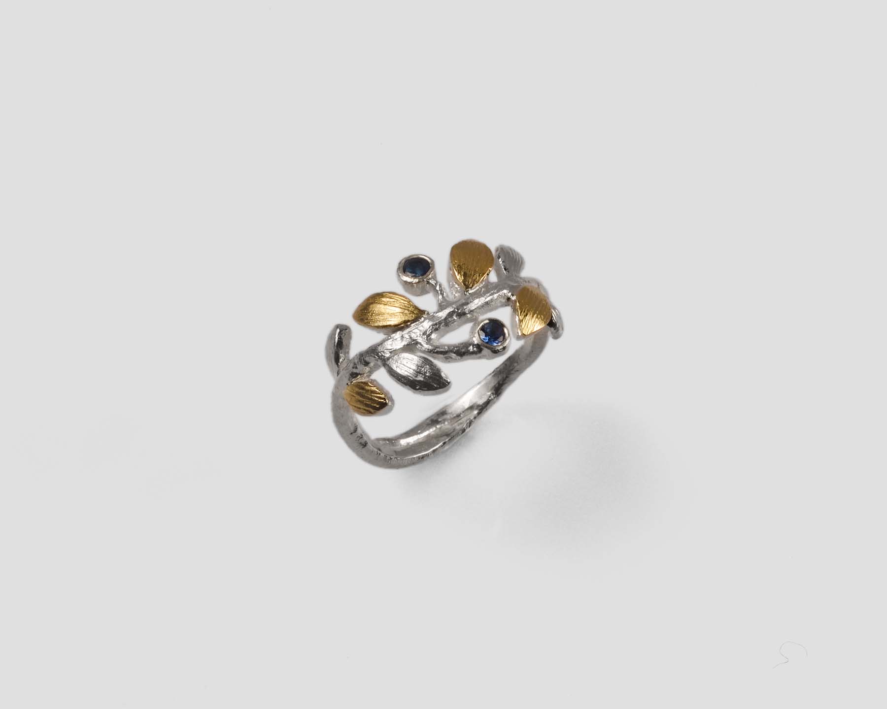 Anel em ramos com folhas riscadas com duas safiras redondas, em prata e ouro.
