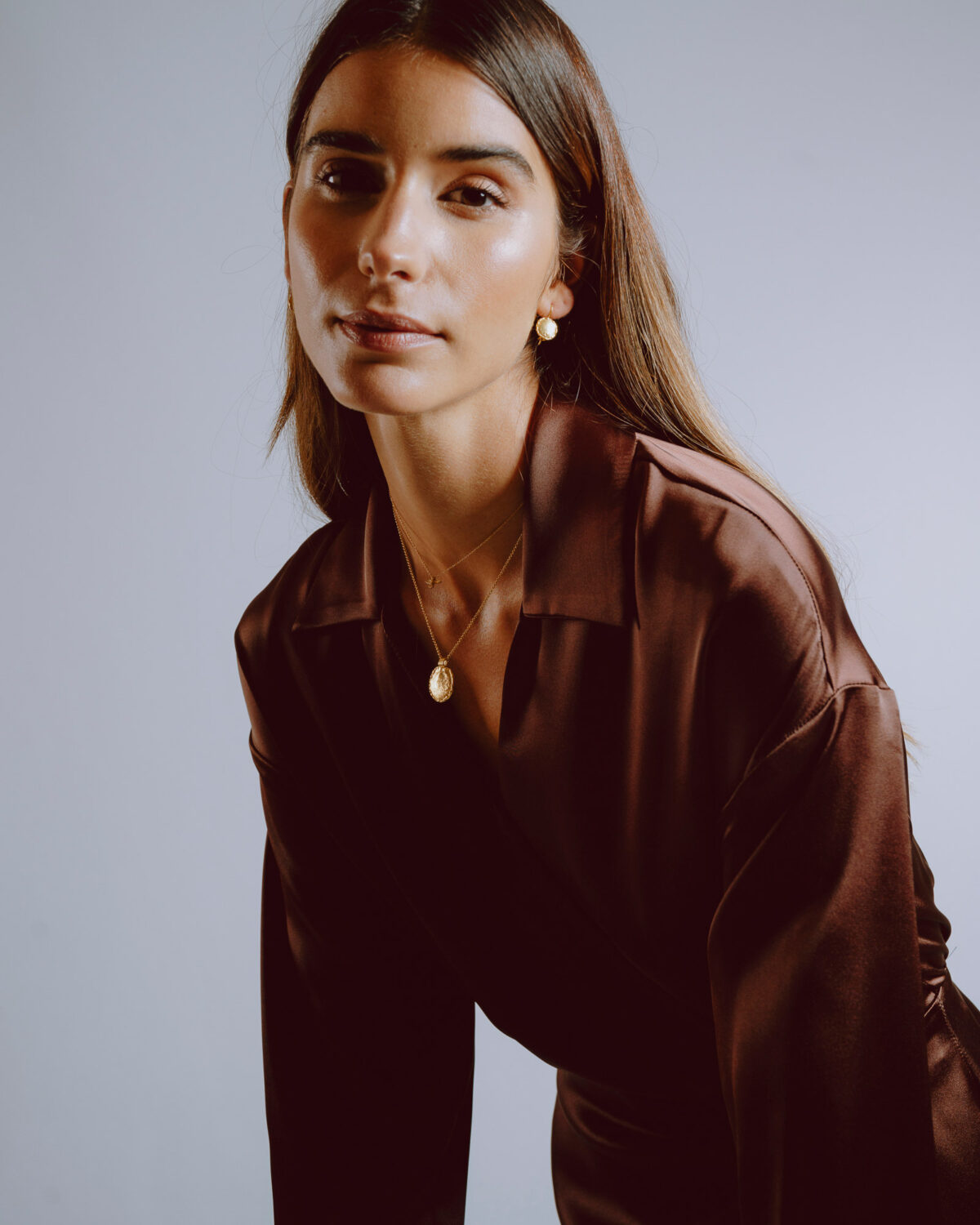 Modelo com conjunto riviera de colar e brincos em prata e ouro
