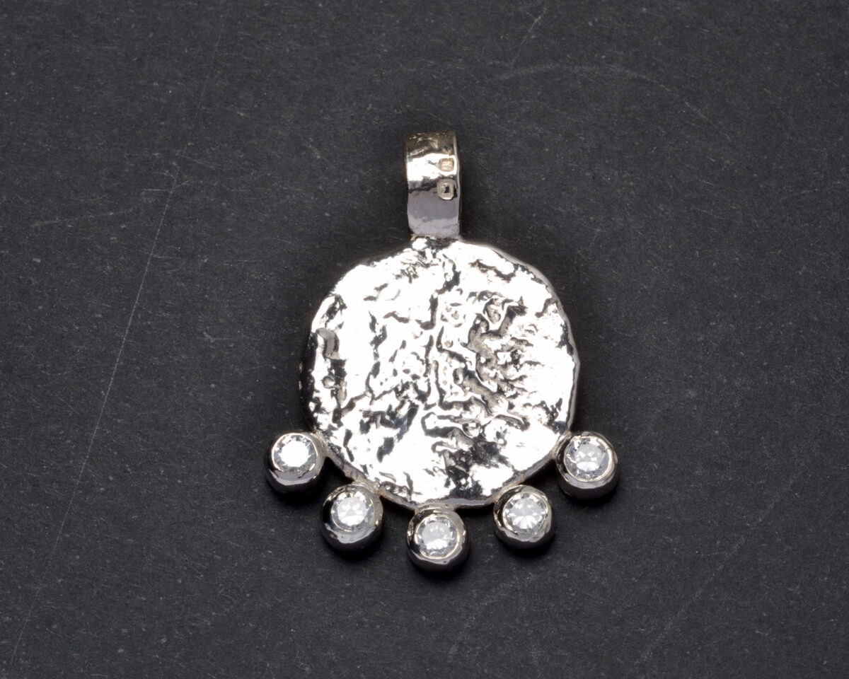 Medalha em prata redonda martelada com 5 zircões em cravação lisa.
